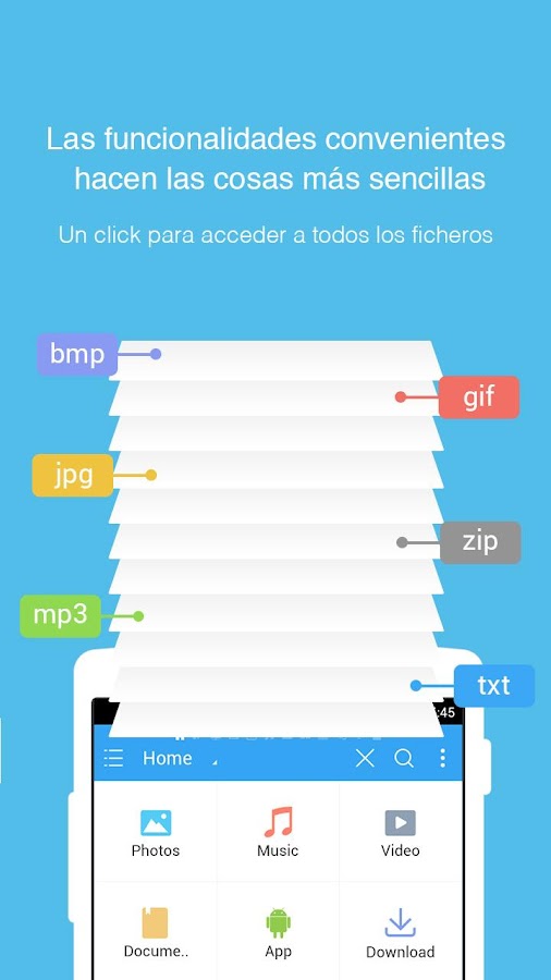 ► Administrador de archivos: Gestione sus archivos tal y como lo hace en su ordenador de sobremesa o en su portátil, empleando Seleccionar todo, Cortar/Copiar/Pegar, Mover, Crear, Eliminar, Renombrar, Buscar, Compartir, Enviar, Ocultar, Crear Acceso Directo, y Marcadores. Todas las operaciones se pueden realizar en archivos locales ( en su dispotivito Android) o incluso de forma remota (desde su ordenador conectádose a una red)